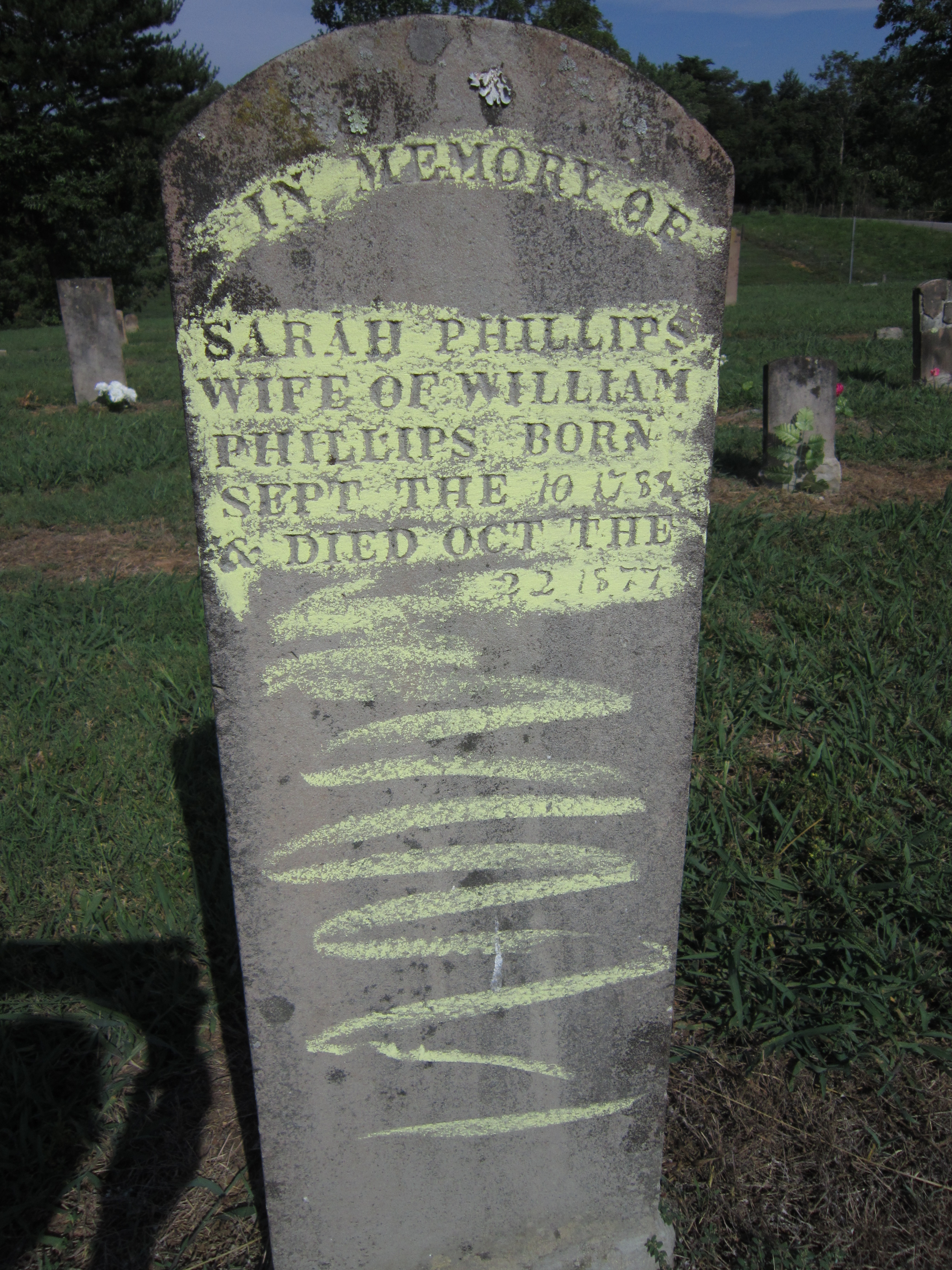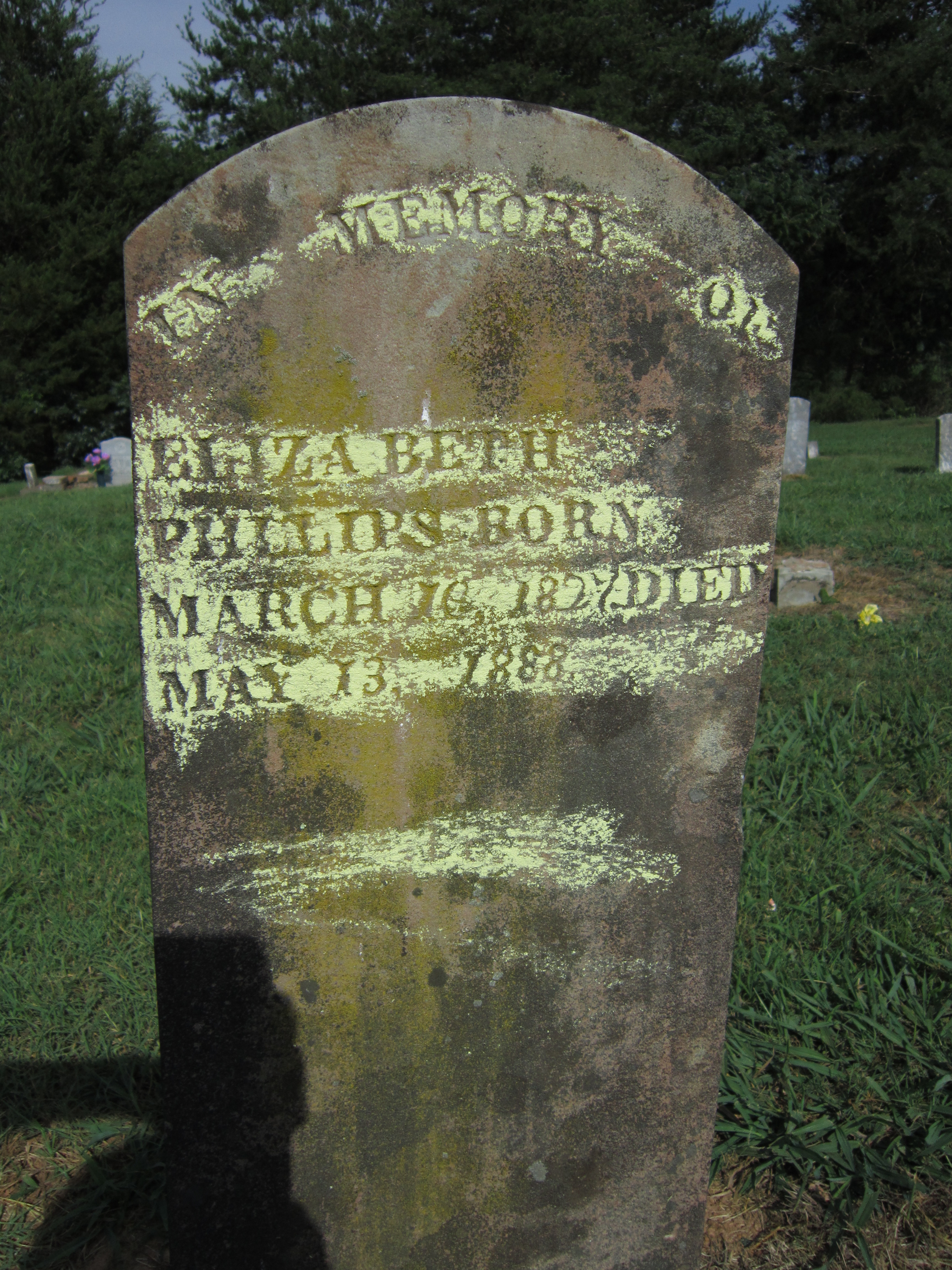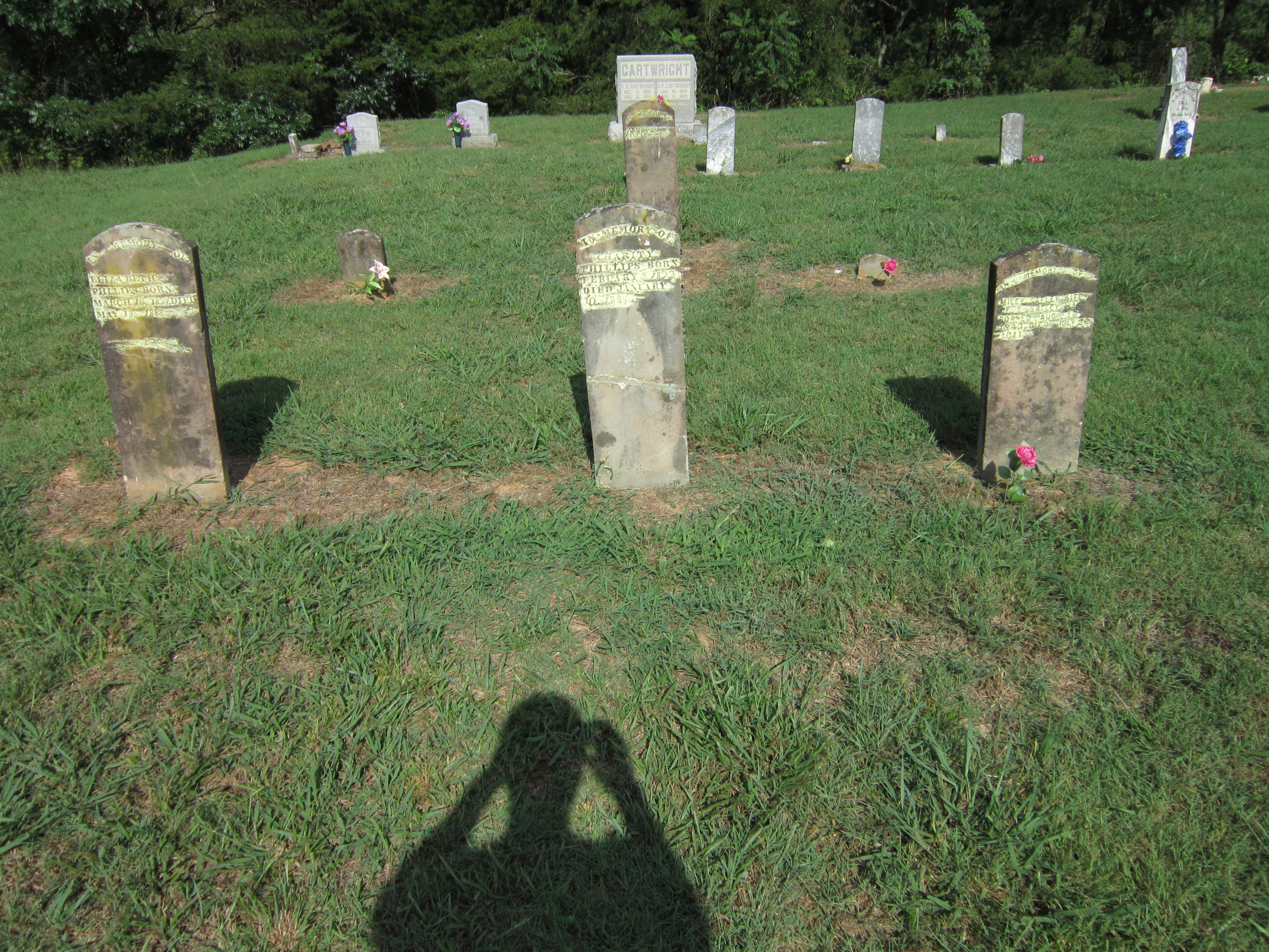 I went to the Smyrna, Tennessee cemetery in Warren County and saw the graves of what I believe are Sarah Phillips, Charity Phillips, Elizabeth Phillips and Milberry “Miley” Phillips. The graves of Charity Phillips, Elizabeth Phillips and Miley Phillips are grouped together and next to one another.