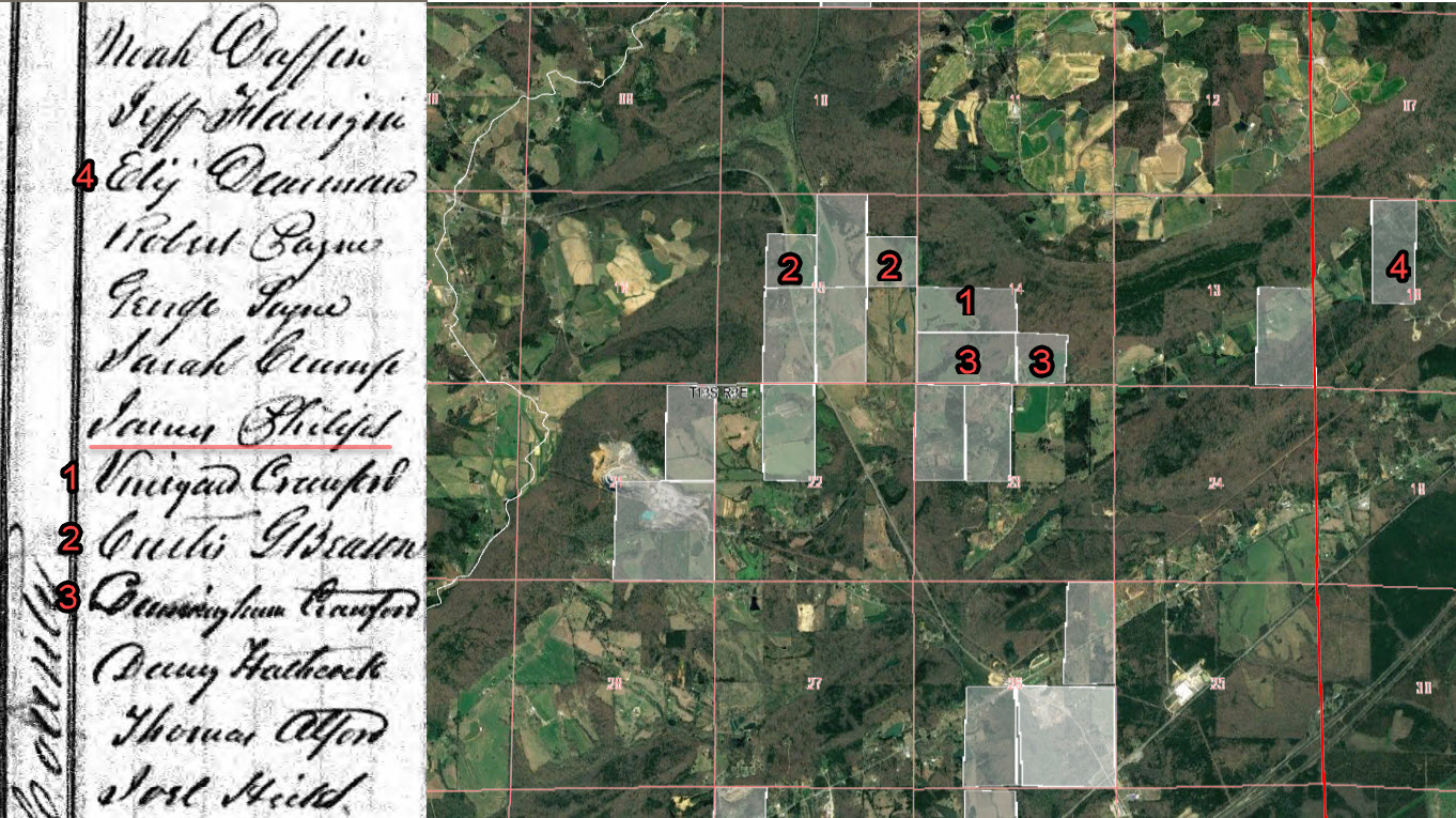 Considering where we think James was living in 1830 (based on neighbors), he would have lived 10 to 15 miles from where his likely father William or his likely brother Zach lived. While there are 6-7 years between that census and the administration of his estate, you can see the path mimics where William traveled in the 1830s. William is living near by 2 of James’ neighbors in the early 1830s, and later William moves northeast closer to Zach’s land.