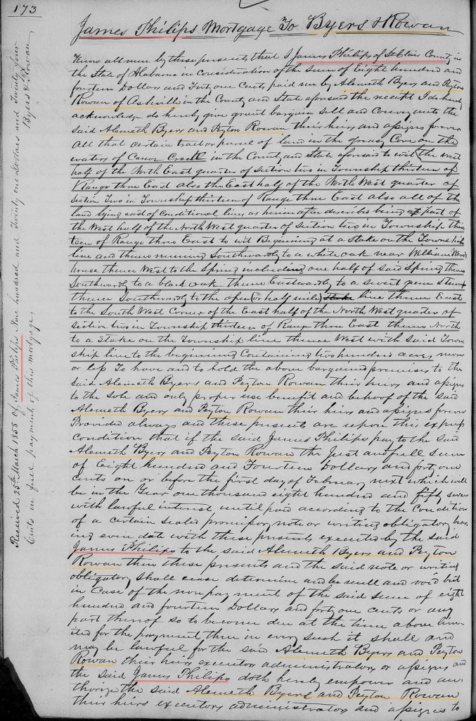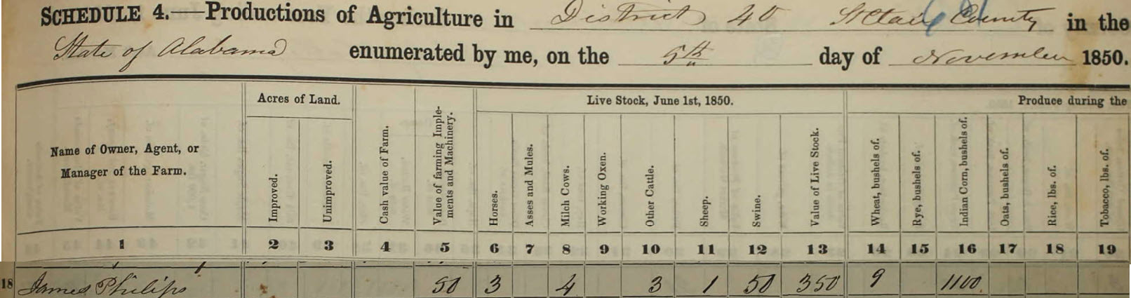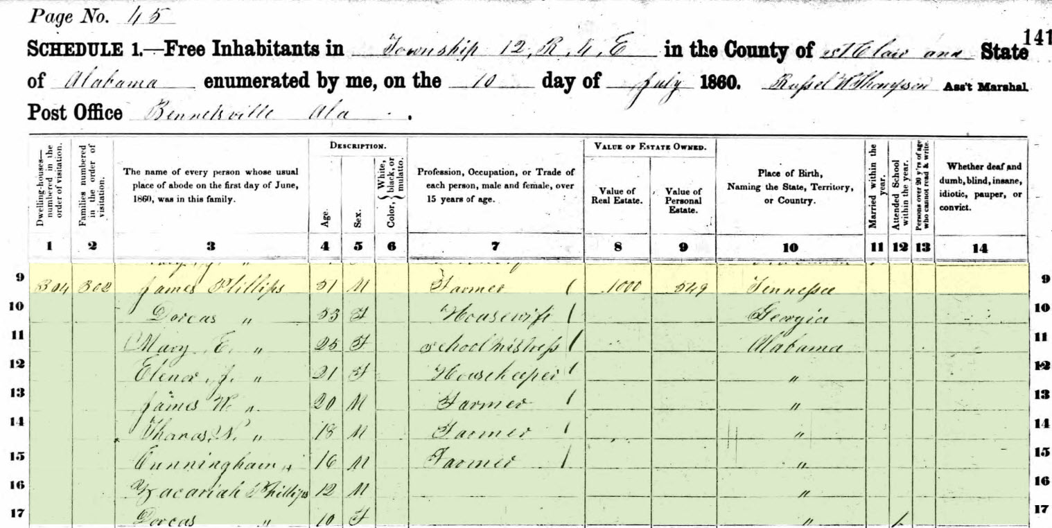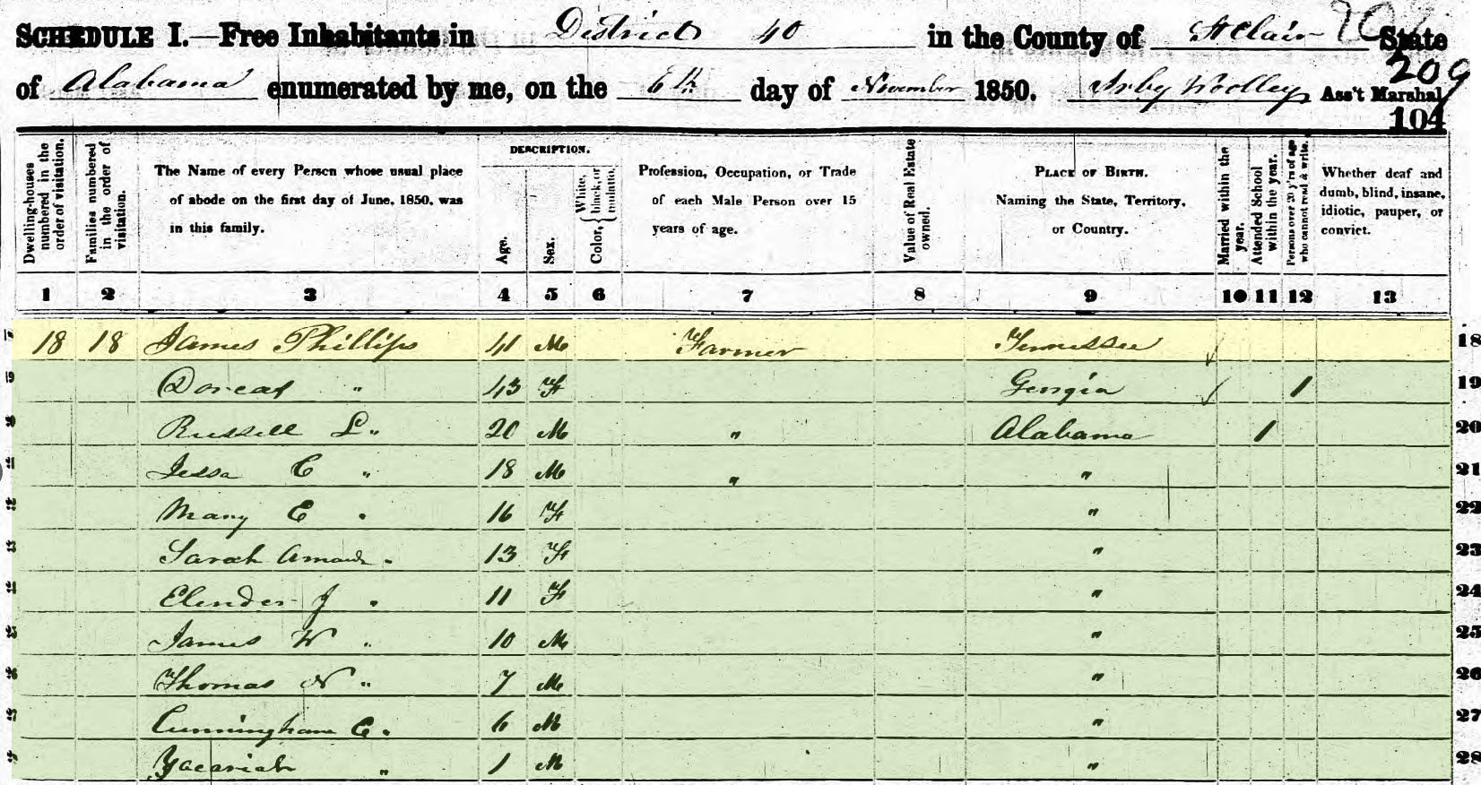James is living in St Clair County, Alabama in 1830. His son Russel has been born already and he’s living with his wife Dorcas Crawford. He would be 21 years old and Dorcas would be about 23 – the ages of the James Phillips in 1830 line up with that (1 Male between 20 and 30, 1 female between 20 and 30). We can be reasonably assured that this is the correct James Phillips.