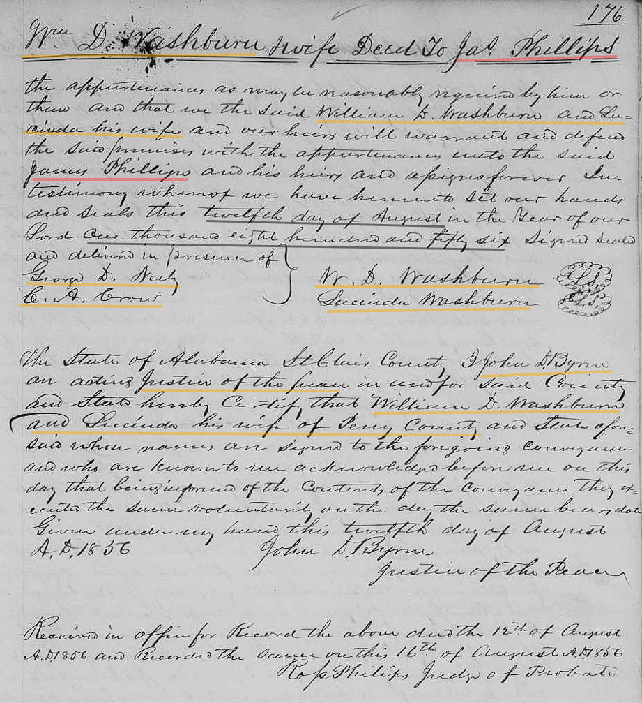 The associated deed follows in the St Clair County, Alabama deed book. James purchases about 200 acres from Wm> D. Washburn