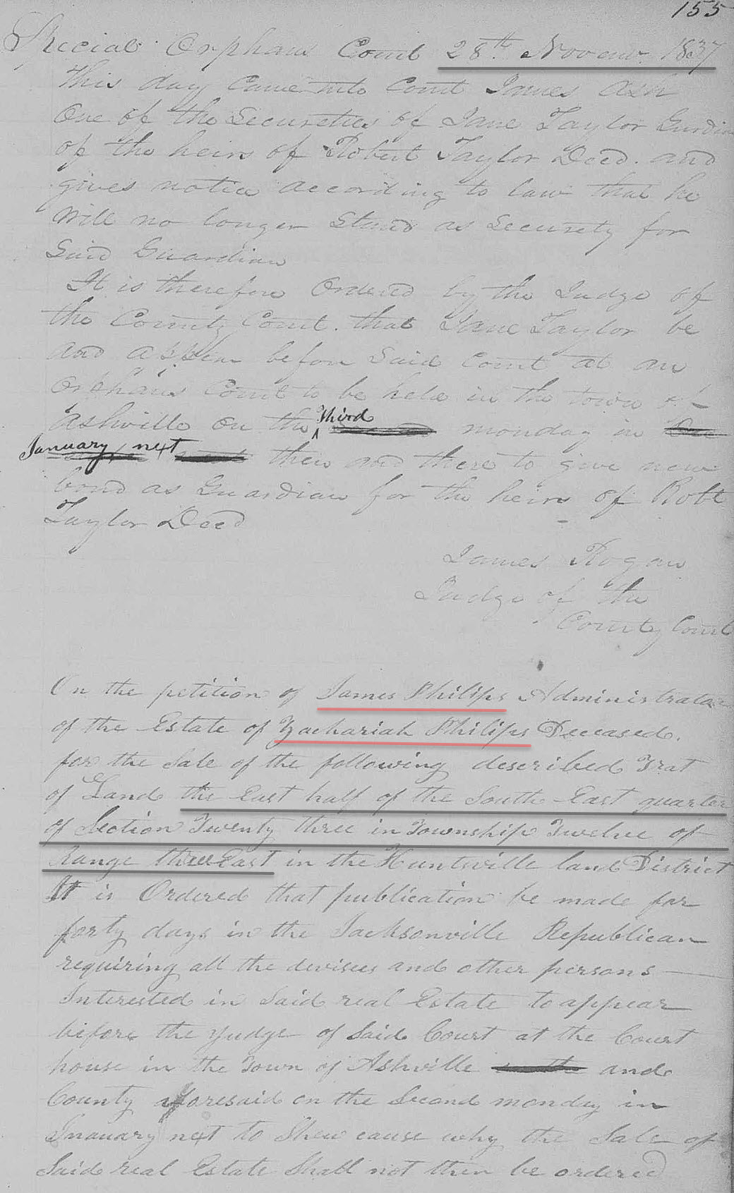 About a month later, James petitions the court to sell Zach’s land on 28 November 1837. I believe that James was had a buyer in mind – the judge orders that the land be publicized in the Jacksonville Republican for 40 days to give anyone interested a chance to tell the judge why it shouldn’t be sold.