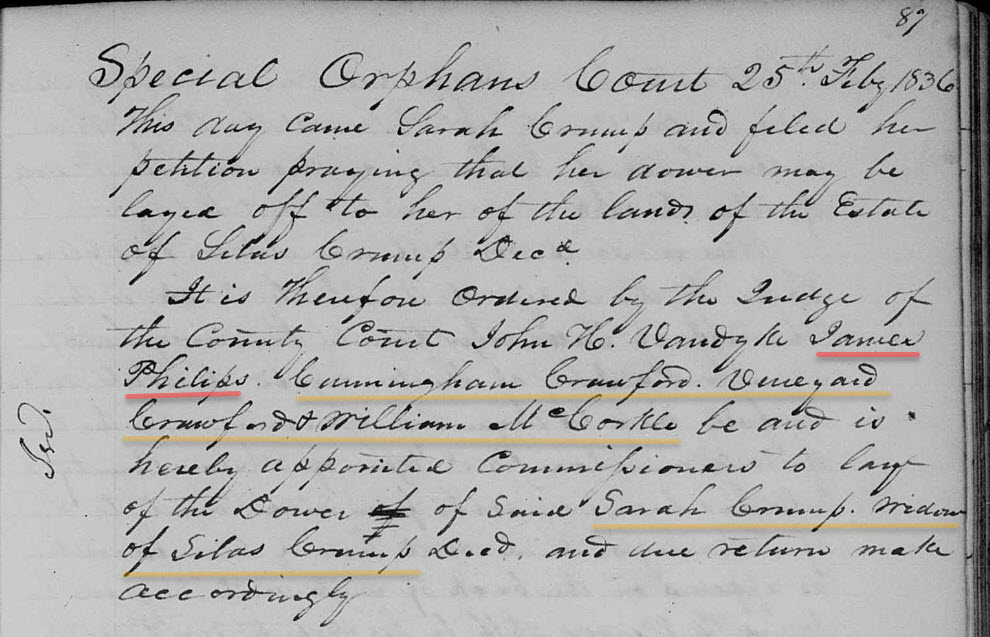 On 25 Feb 1836, James was appointed to lay the dower of Sarah Crump, widow of Silas Crump.