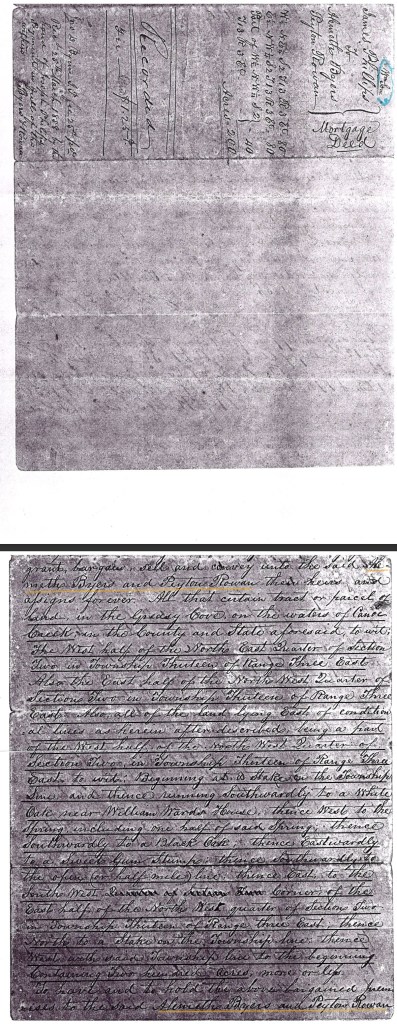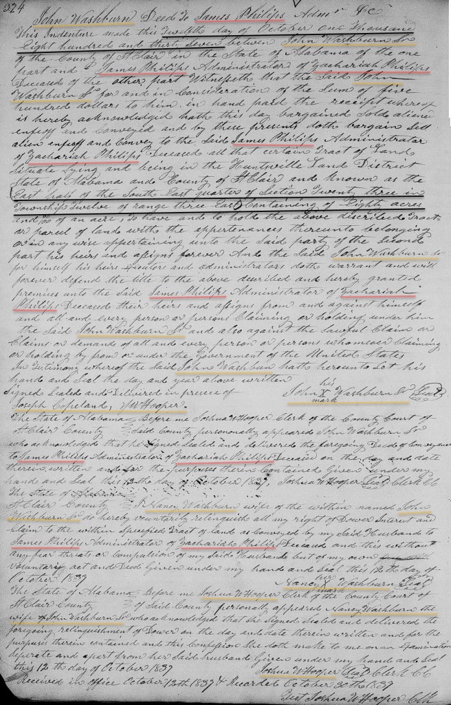It looks like there were many moving parts in the Administration of Zach’s estate. First, on 12 October 1837, James purchases 80 acres from John Washburn, Sr. (husband of Nancy Washburn). Joseph Copeland (father in law of Joseph Phillips) witnessed the need as well as JW Hooper (clerk of St Clair County).