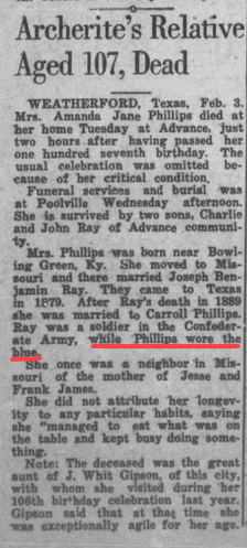 One interesting tidbit – hat tip to Pat for this! The obituary for Amanda lists her death date, and facts about her previous two marriages. One of those fact was that Carrol fought for the Union!