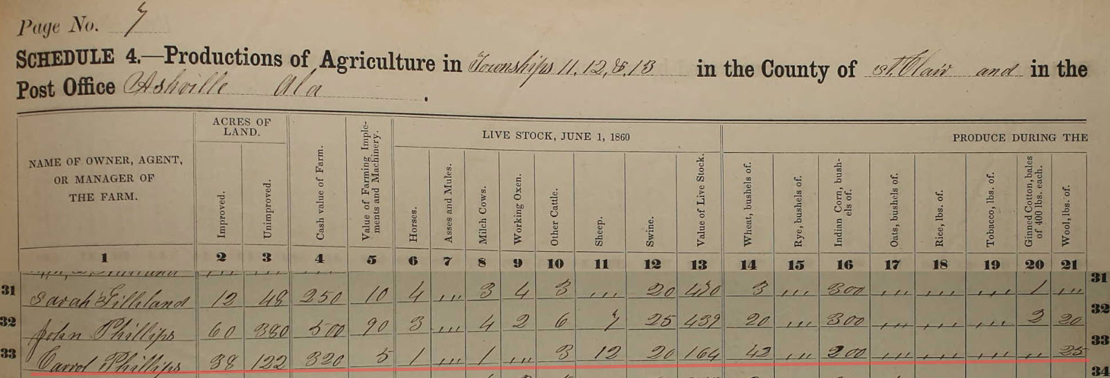 In 1860, Carroll is living with Martha, his son William C. (8), Sarah E. (6), and Maryann M (1). Carroll is living next door to his brother John and Celia (Brothers) Phillips, and has a real estate value of $320.