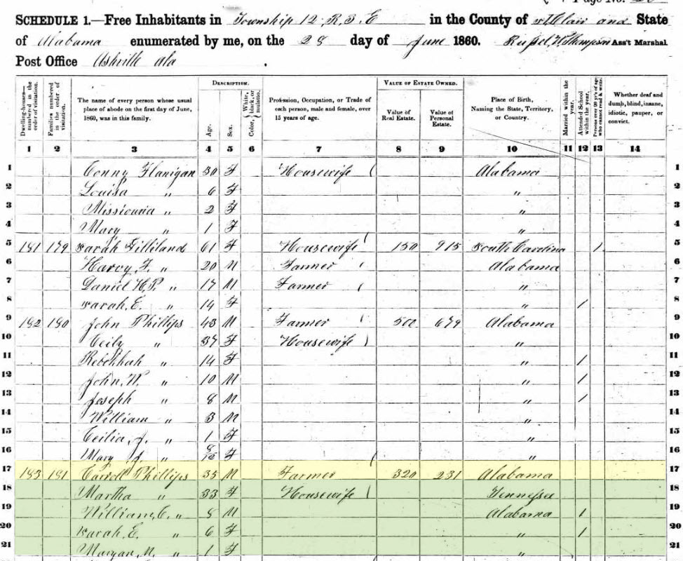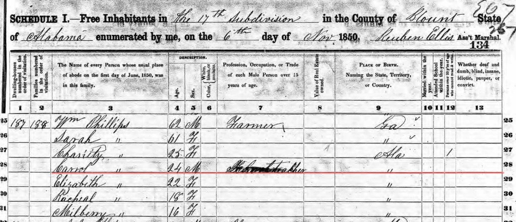 In 1850, we see that Carrol is 24 years old and still living at home. Noted as born in Alabama. William is renting – he does not own any land.