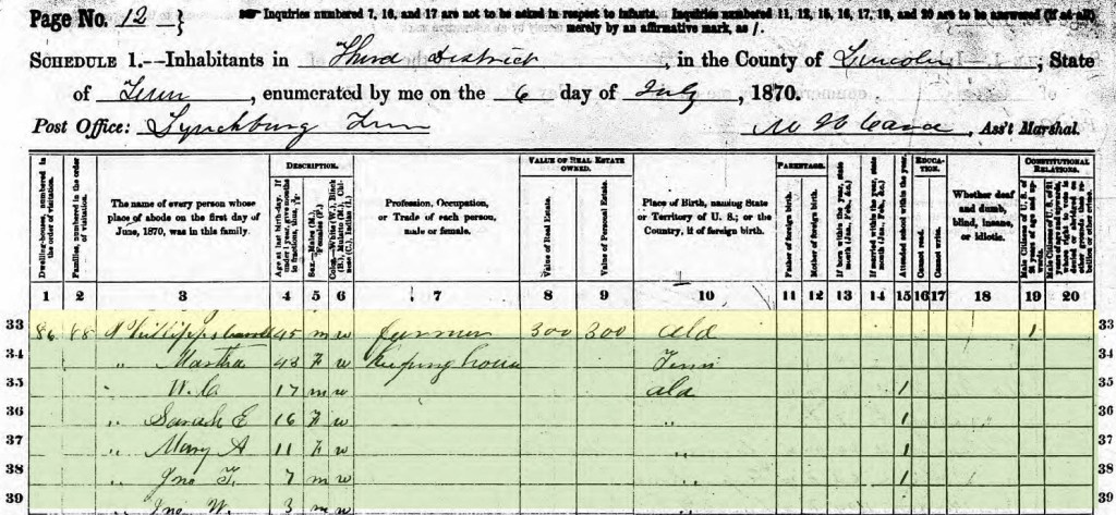 According to the 1870 census, Carroll left for Lincoln County, Tennessee. Future research should look into others that may have moved with him. I am unaware of any family members that are living in the area, and the rest of his immediate family moved to Warren County, Tennessee. Carroll is living with Martha, and kids William Carrol (17), Sarah E. (16), Mary A (11), John T. (7), Jon W. (3)