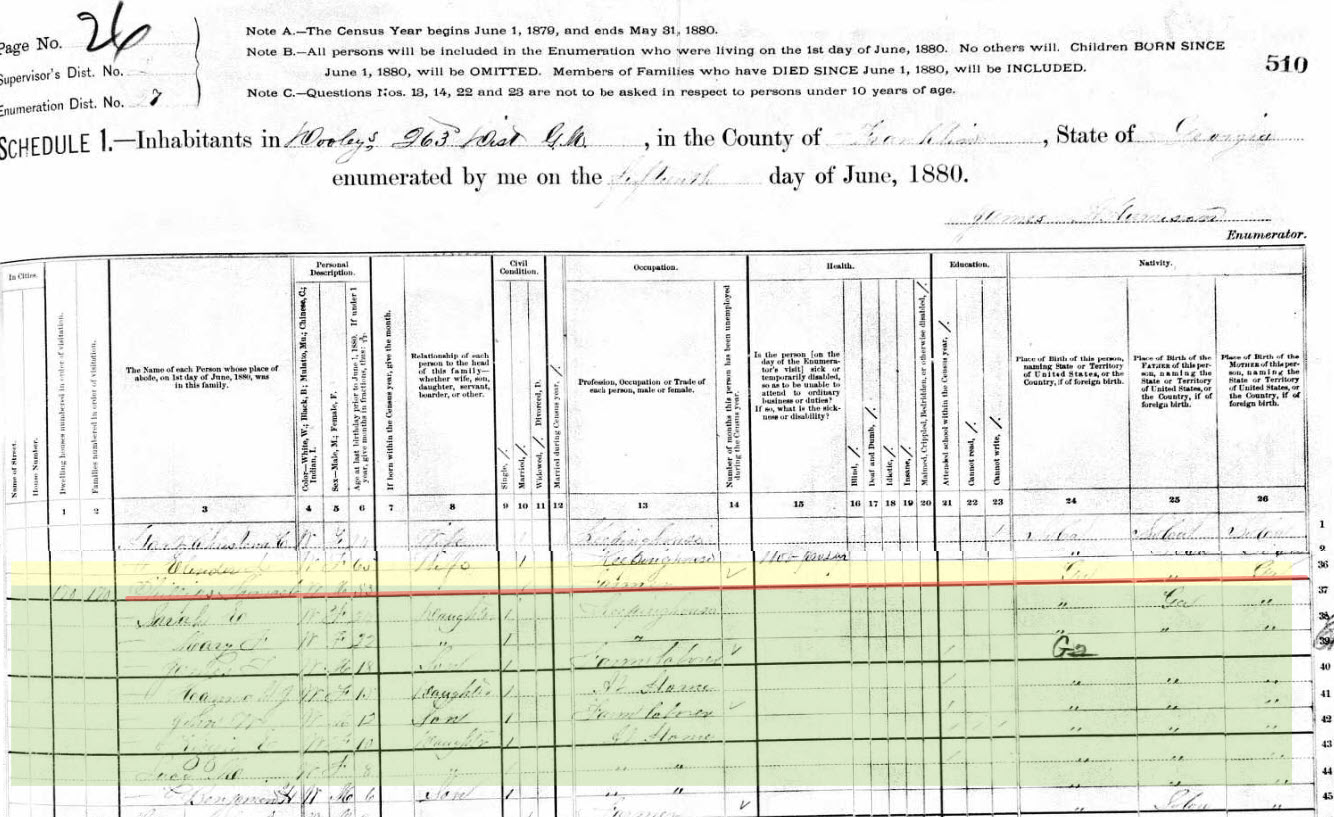 Carroll is living with his children – it appears that Martha has passed away. William Carrol appears to be out of the house as well. Sarah E (24), Mary F (22), James T (18), Hannah J. (15), John W. (12), Kizzie (10), Lucy (8) and Benjamin (6). Based on the response to the census taker, I am betting that it wasn’t Carroll that answered the door!