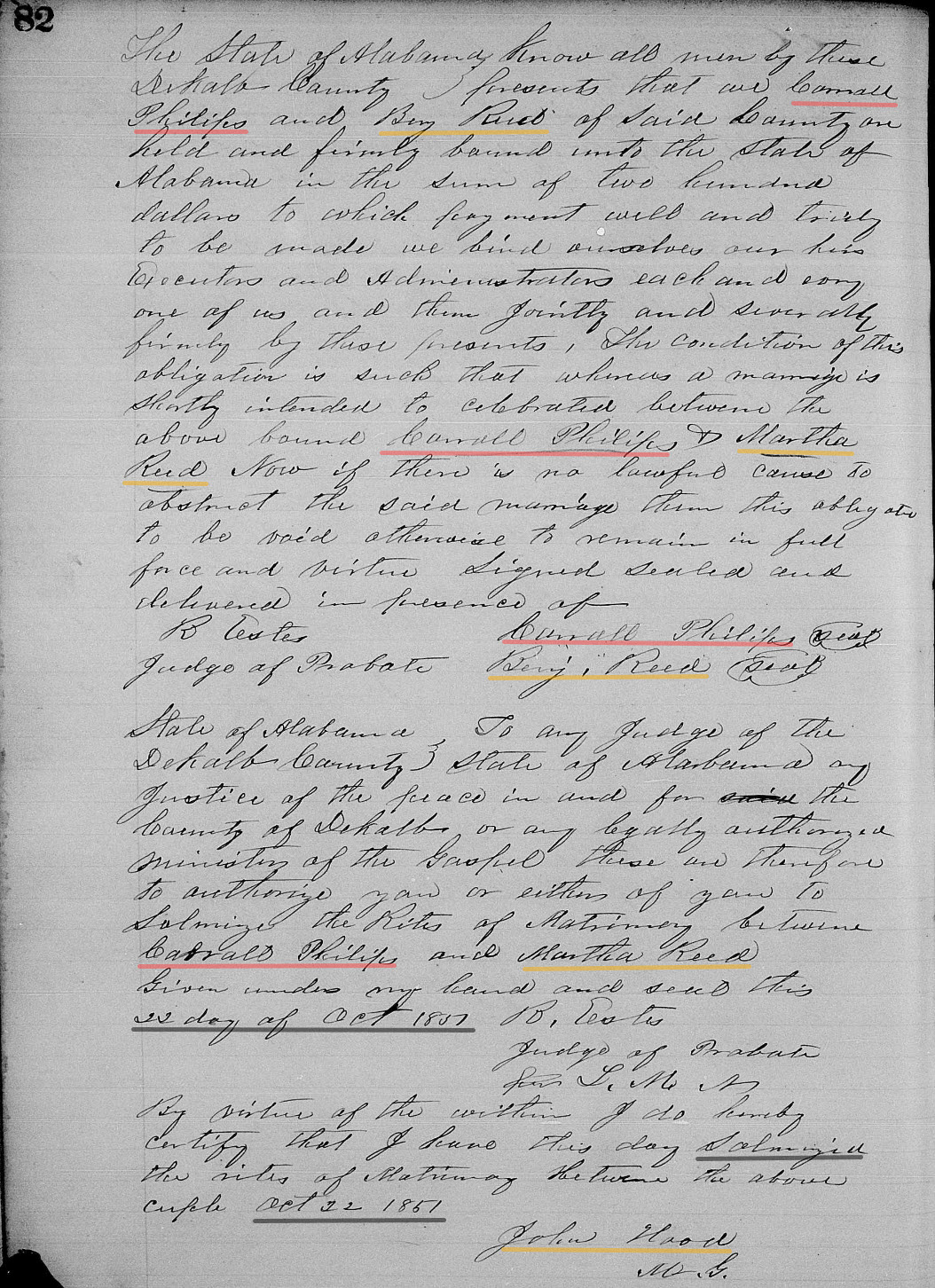 Carroll and Bery Reed/Reid put up $200 bond for the marriage bond. The marriage is solemnized on 22 Oct 1851