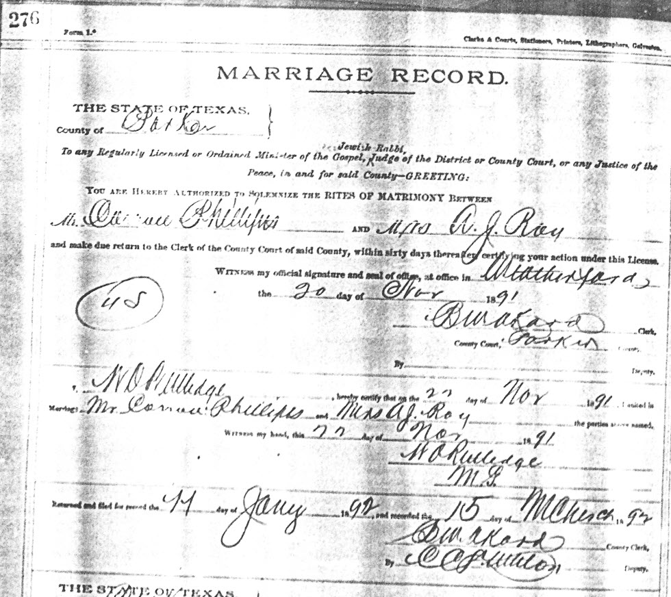 The 1890 Census is effectively missing, save for some counties. Fortunately, I have contacted with a descendent of Carroll, and found a whole new move to Texas (and beyond!). It looks like Carroll moved over to Parker County, Texas and married an Amanda J. (Holman) Ray. This was neither person’s first marriage – Amanda married a Joseph Benjamin Ray.