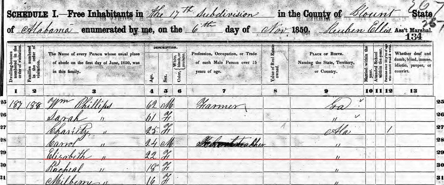 In 1850, we have the first written record of Elizabeth. She is living at home with her parents, but the family has moved to Blount County, Alabama. She is 22 at this time.