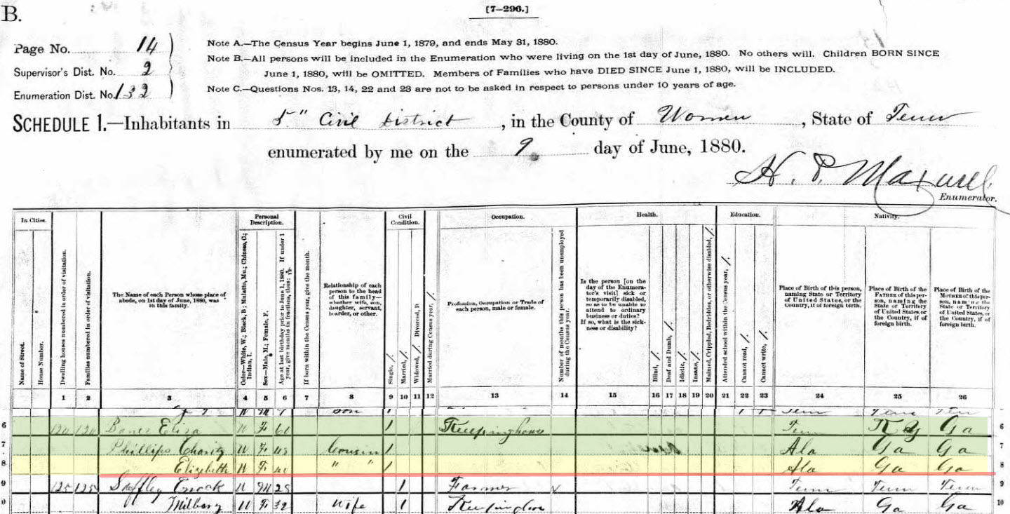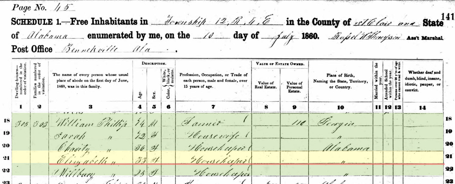 Elizabeth is living with her mother Sarah and her sisters Milberry and Charity. Elizabeth is 43 years old. While the census has “Father is of foreign birth”, I’m betting they misheard him say “Was your father born here?” She is noted as being born in Alabama, although her mother Sally (nickname for Sarah) is said to be born in North Carolina. The head of the household is Charity Barnes, likely born Charity Phillips, who is living with her daughter Eliza Barnes.