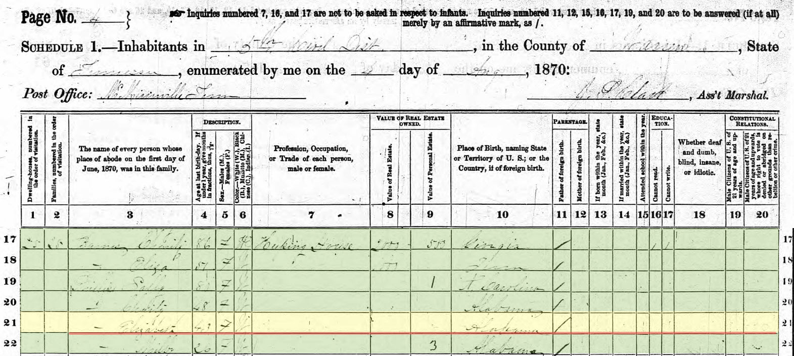 I cannot find any record of this family in the 1866 Alabama. State Census. This makes me think they moved before 1866, as we find them in Tennessee in 1870.