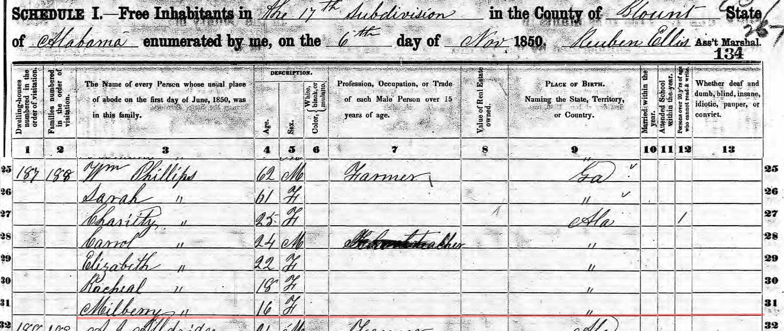 Milberry is noted in the 1840 Census as a mark in the Females 5 to 10 years old. She is living with her parents William and Sarah, in St. Clair County, Alabama.