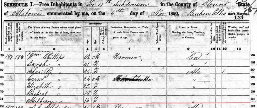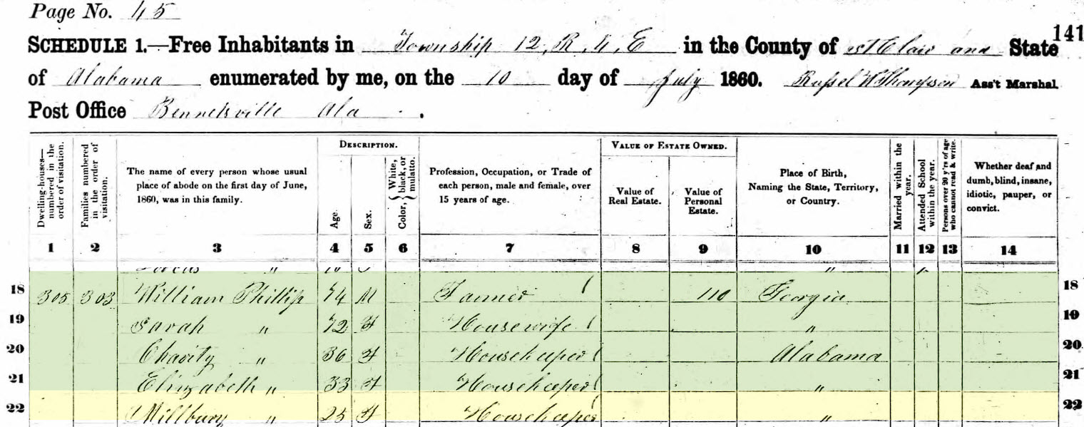 In that 1830 census for William Phillips in St Clair County Alabama, I think that she is listed as that female age 15-19.