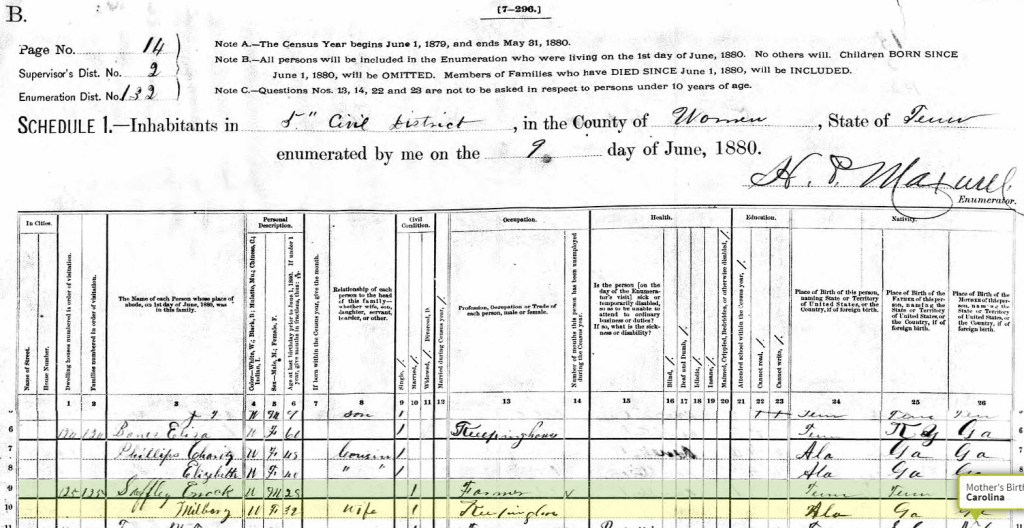 In 1880, Enoch and Milberry are living next door to Milberry’s Mom and sisters. Milberry is noted as 32 years old, about a decade younger than reality. But her husband is 28, so I imagine they were just trying to not make it appear like too large an age gap!