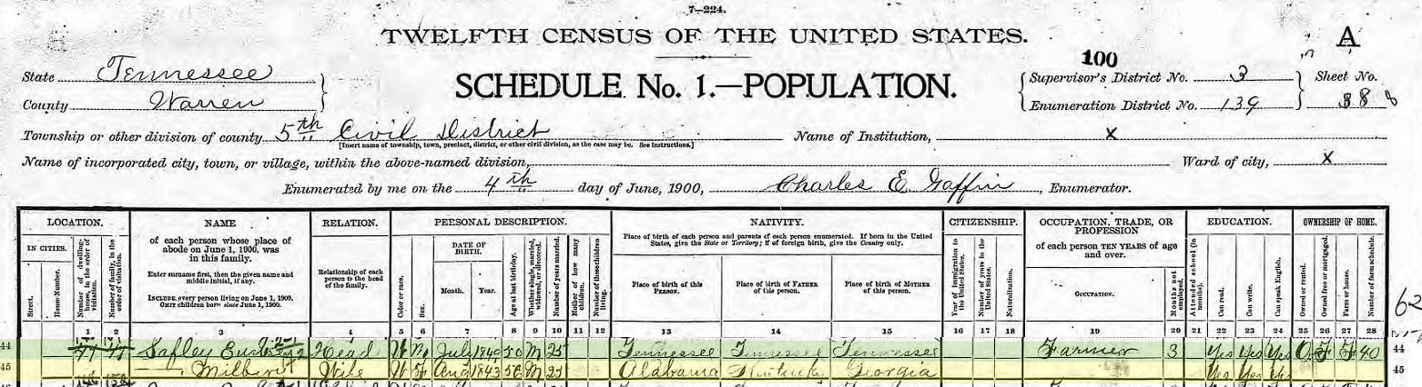 The 1890 census being mostly lost, the next record available is the 1900 US Federal Census. Only Milberry is left, the rest have died. She is listed as a wife and birth month and year as August 1843. She can read and write, and she is now 56, her husband is 50. The reality is she is born in 1834.