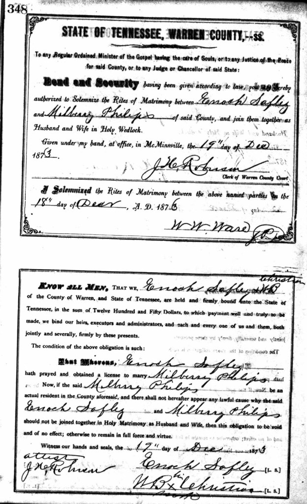 According to the Tennessee Marriage Records, Warren County, Tennessee, Enoch Safeley and Milberry Philips married. They solemnized the marriage on 18 December, 1873 and got the license the next day. Enoch Safely and WB Christian provide the bond, with John Rohume (?) attests.